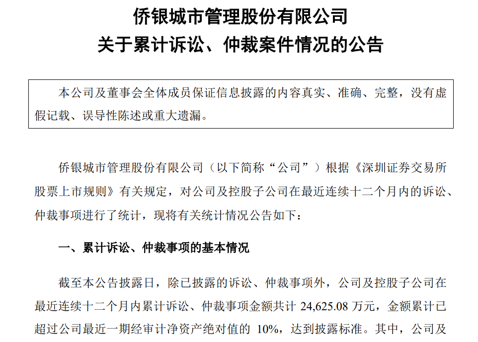 6月20日晚间,有“环卫第一股”之称的侨银股份(002973)公告,公司及控股子公司在最近连续十二个月内累计诉讼、仲裁事项金额共计2.46亿元,已超过公司最近一期经审计净资产绝对值的10%,达到披露标准。